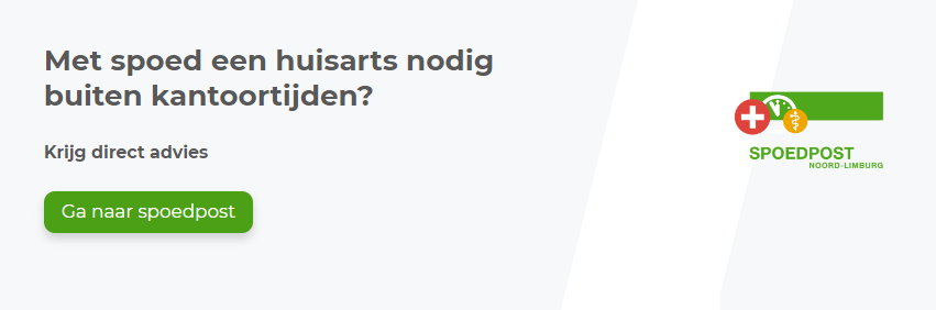 Alle huisartsen in de regio Noord-Limburg werken buiten kantooruren in extra diensten samen op de huisartsenspoedpost in Venlo. De huisartsenspoedpost is uitsluitend bedoeld voor spoedgevallen ’s avonds, ’s nachts, in het weekend of tijdens feestdagen. In alle andere gevallen kunt u de volgende werkdag terecht bij uw eigen huisarts. Voor uitgebreide informatie over de huisartsenspoedpost, klik hier. U leest hier waar de huisartsenspoedpost wel of juist niet voor bedoeld is en hoe de huisartsenspoedpost werkt.